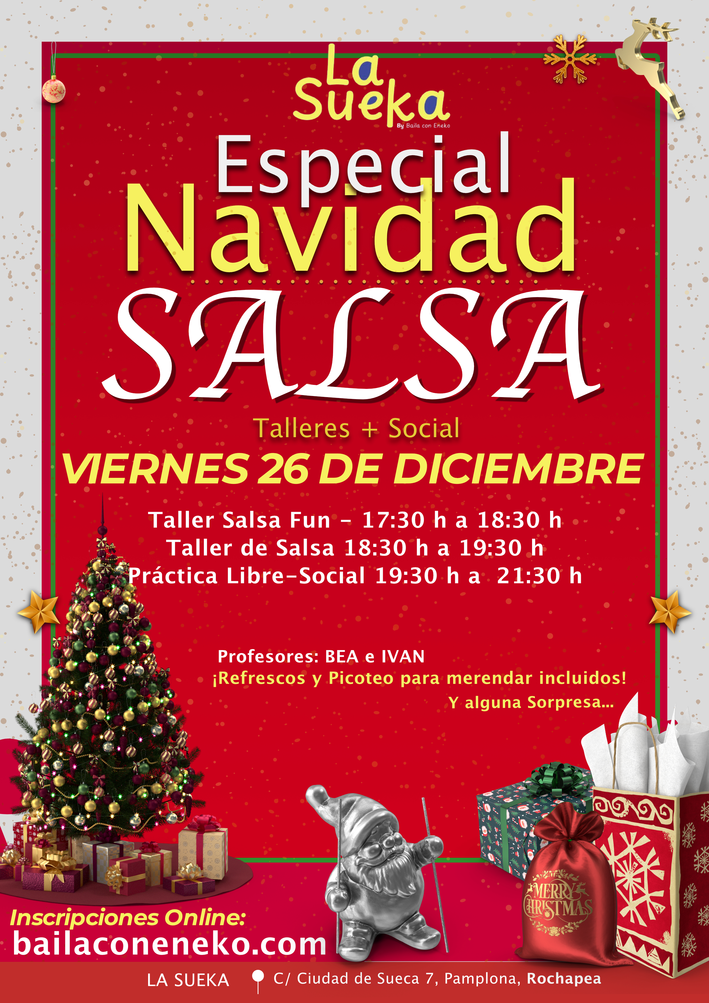 Un día Especial de Salsa en Navidad, 2 horitas de clase evolutivo (17:30 h a 19:30 h), desde nivel básico iremos complicando poco a poco, ejercicios, combos y técnica..... Recomendable a partir de nivel Medio hasta avanzados. 2 horitas de social (19:30 h a 21:30), donde podéis practicar lo aprendido, e ir recordando todo lo aprendido este curso.