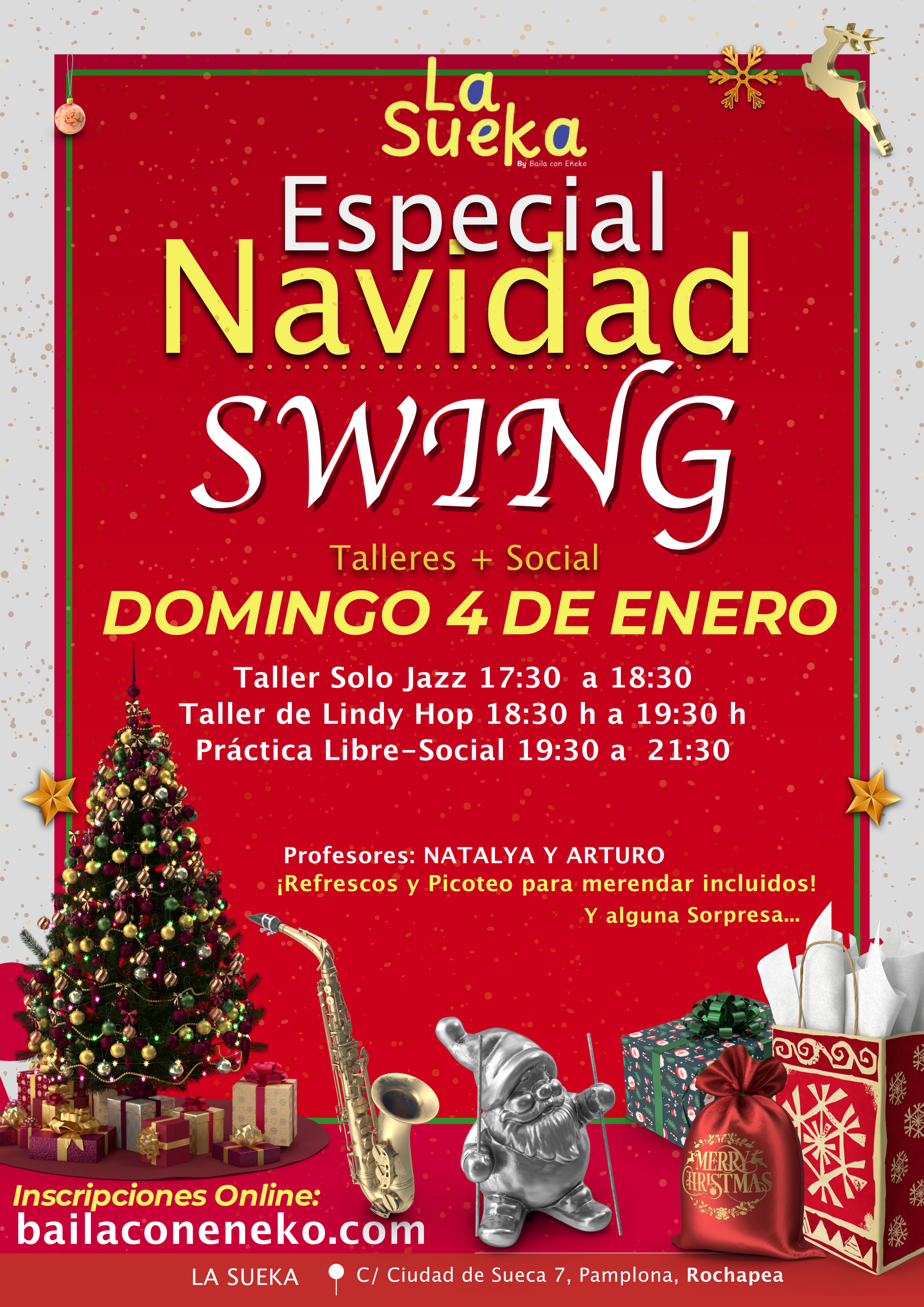 Un día Especial de SWING en Navidad, 2 horitas de clase (de 17:30h a 19:30h) , Una hora de Solo Jazz y Una hora de Lindy Hop, desde nivel básico iremos complicando poco a poco, ejercicios, combos y técnica..... Recomendable para todos los niveles. 2 horitas de social (19:30 h a 21:30), donde podéis practicar lo aprendido, e ir recordando todo lo aprendido este curso.